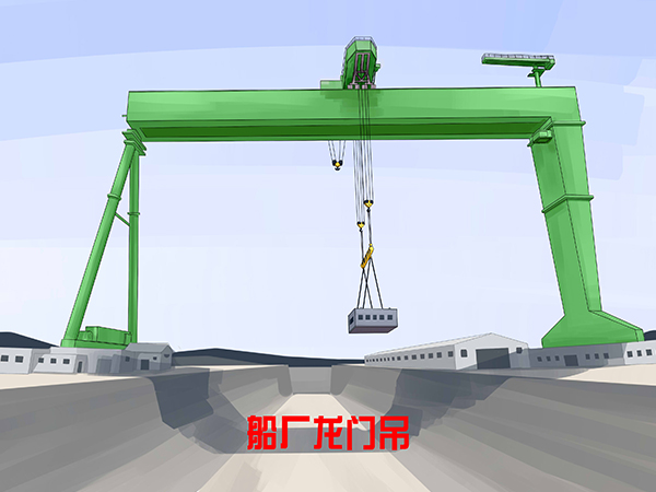 用以船臺組裝船殼,要有兩部起重吊裝小轎車:一臺有兩個主鉤,在橋架子上翼緣板的導軌上運作;另一臺有一個主鉤和一個副鉤,在電纜橋架下翼緣板的導軌上運作,便于旋轉和起吊大中型的船殼按段。